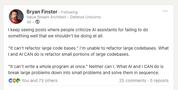 There was also this post from Bryan Finster on LinkedIn putting expectations into perspective: