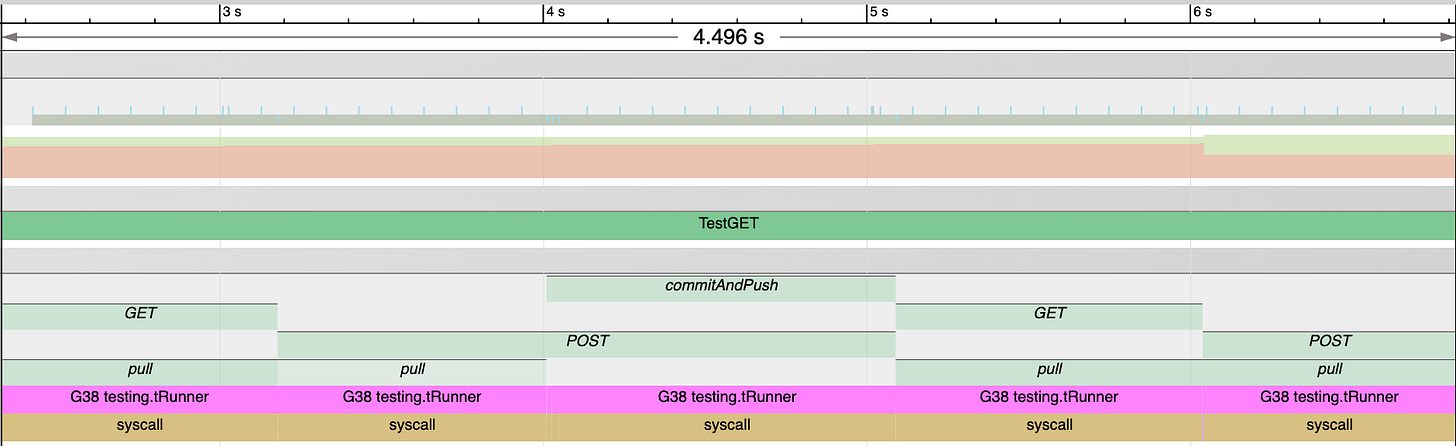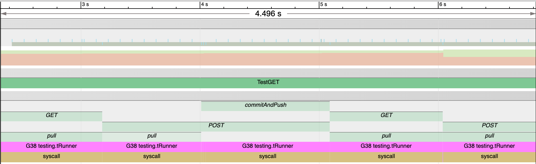 For comparison, I added tasks and regions for runtime traces and loaded example trace files with go tool trace. Screenshots of the relevant segments of these traces are below, with Git first:
