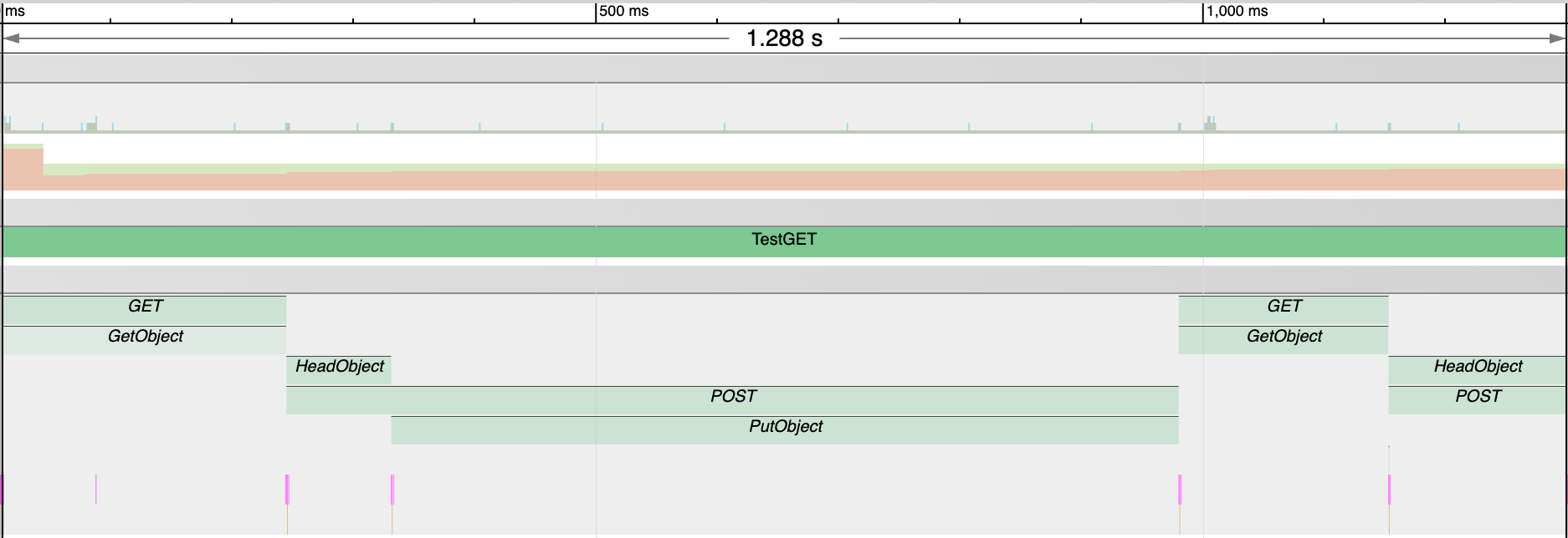 From this quick example, we’re seeing the object storage backend being about 4x faster than the Git backend (not including the intial clone). We also see the Git operations dominated by git pull, with each call taking ~800ms, compared to ~200ms for a GetObject call for object storage. Given that the bulk of the test with object storage is dominated by PutObject, you can imagine that a more read-heavy request breakdown would leave Git looking even worse off.