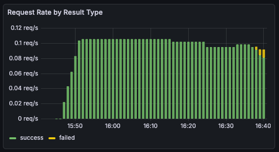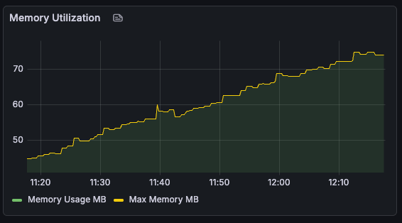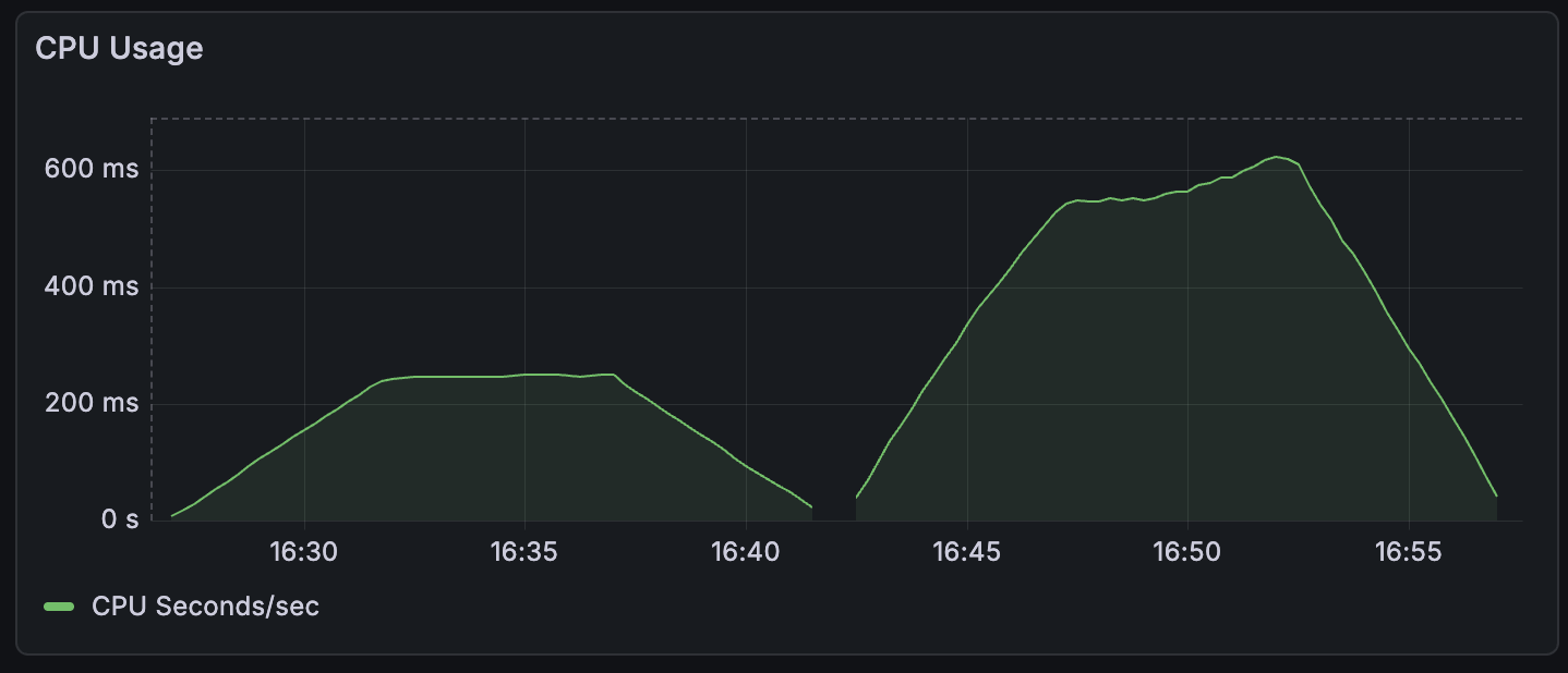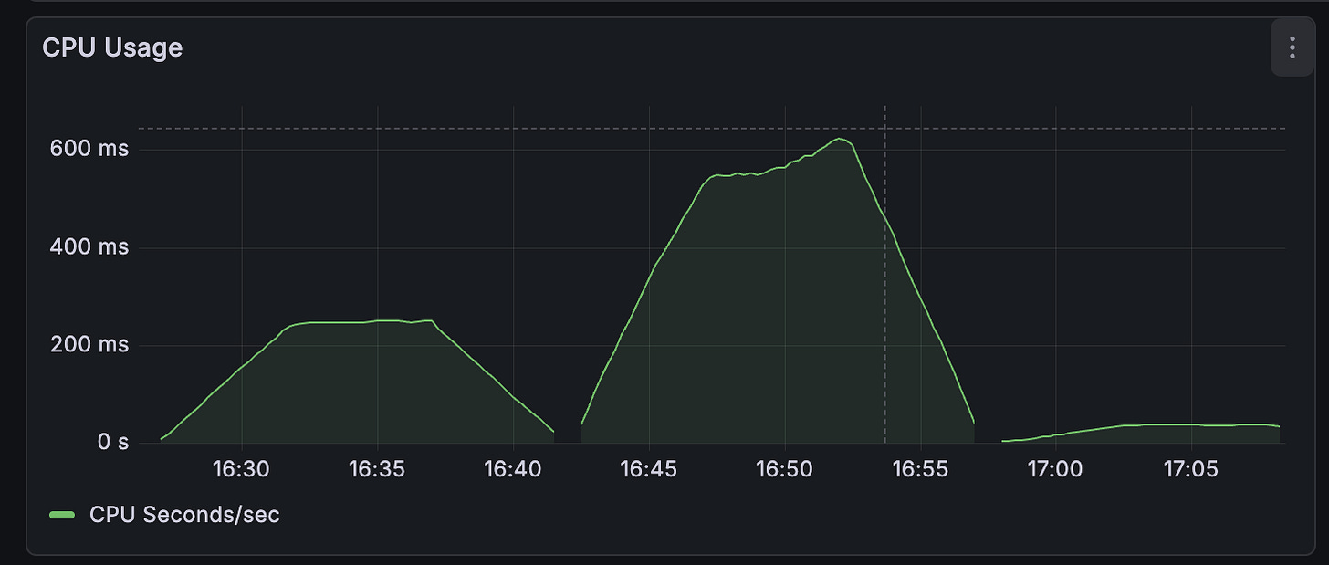 I wanted to run the server and fire off many requests over a long-ish period of time. This wasn’t going to be a hefty load test, more of a soak test with a low but steady flow of traffic. So running locally with Docker Compose would be fine. I needed to keep an eye on request duration and resource utilization, so added Grafana and Prometheus to the config.