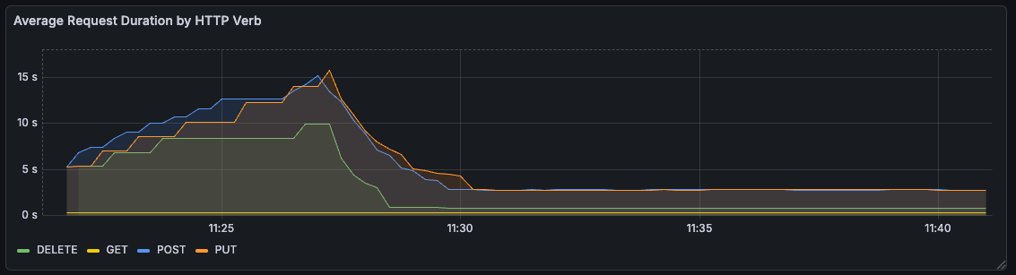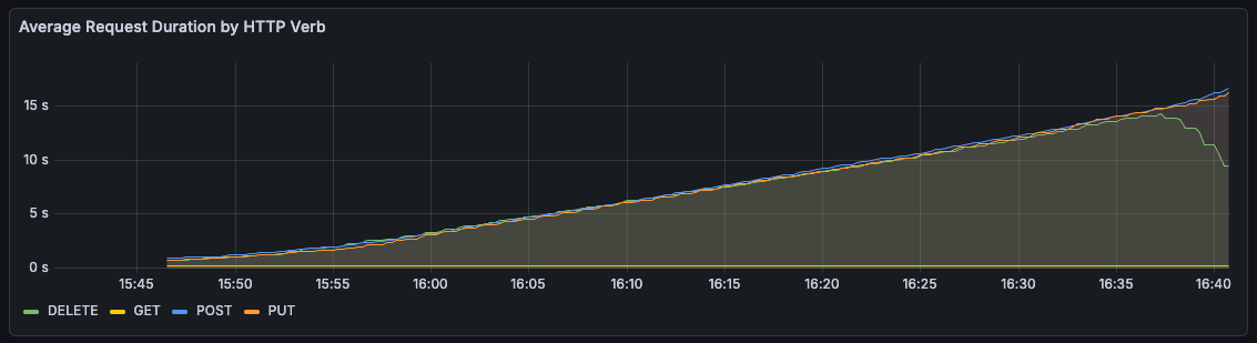Towards the end of the hour, it even got to the point of HTTP timeouts. This seemed to lock up the server entirely, and all subsequent write requests would time out until a restart.