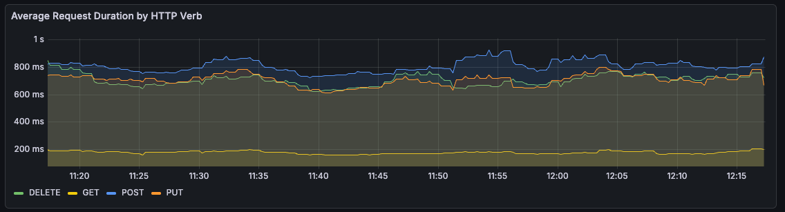 My first run was an hour long, with a single test cycle each minute. Over the hour, the average duration of request was pretty stable, if a bit slow for write operations.