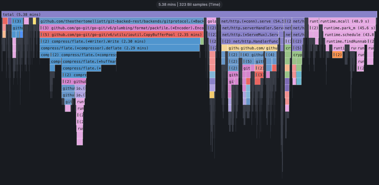 2026/01/05 16:40:16 Action #54 failed: failed to delete second resource: executing DELETE request: Delete "http://localhost:8080/sthenic-Mitella-batlan": context deadline exceededI added Pyroscope to the Docker Compose config to capture profiles sent by the server. This let me see flame graphs for memory and cpu utilization during the course of a test run.